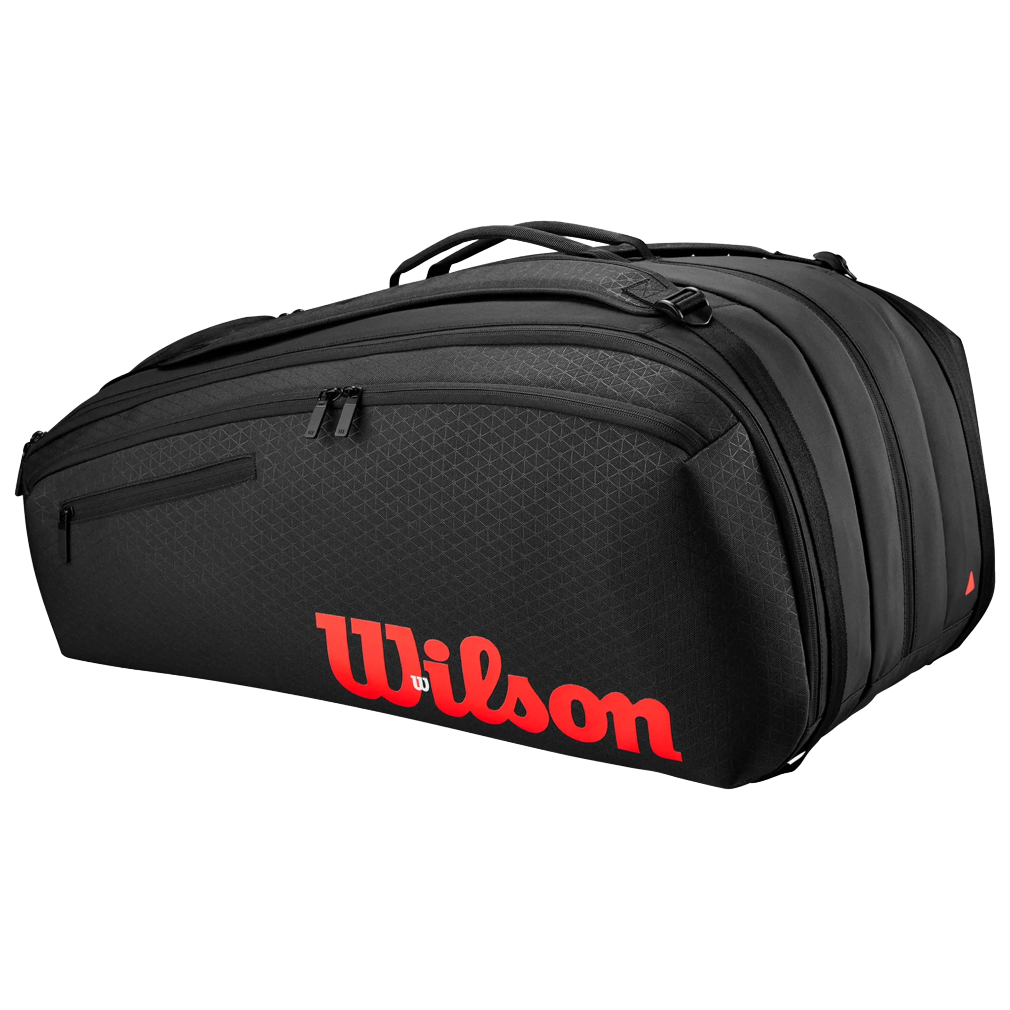 Perfect for the high-level tennis player in search of a bag to perfectly match their game, the Clash V3 Super Tour 15-pack from Wilson combines top performance with the visual appeal of the latest Clash line. Crafted from premium, durable material with a subtle triangle pattern to match the Clash design, this bag utilizes three main compartments to store up to 15 rackets, including two with a Thermoguard lining to protect them from extreme temperatures. Three additional exterior pockets are great for balls, grips, other accessories and personal items, while a ventilated shoe pocket provides storage for used gear. Wilson's dual carrying system lets you haul by hand or wear like a backpack, and the triangular carabiner lets you hang the bag from the court fence.